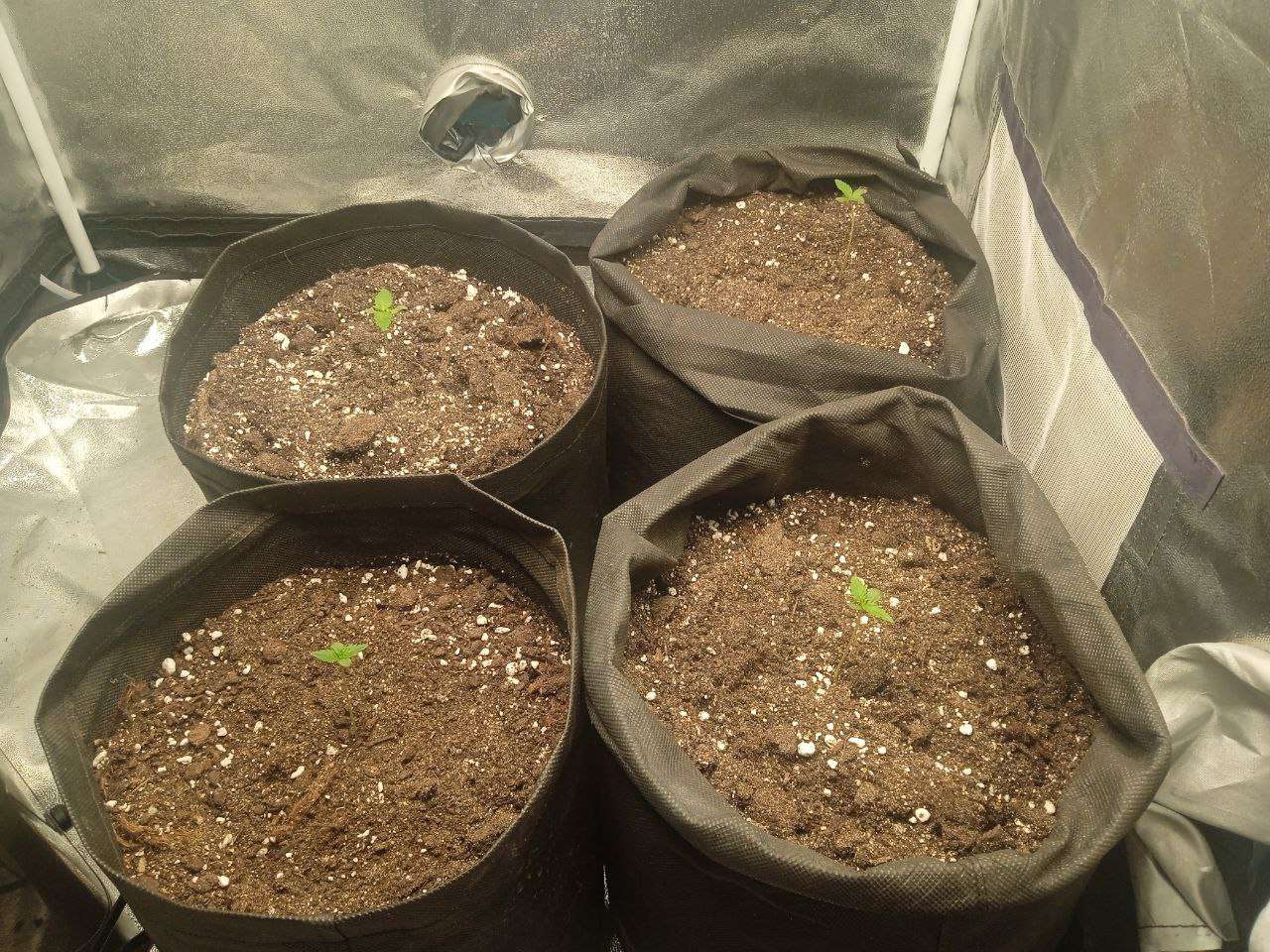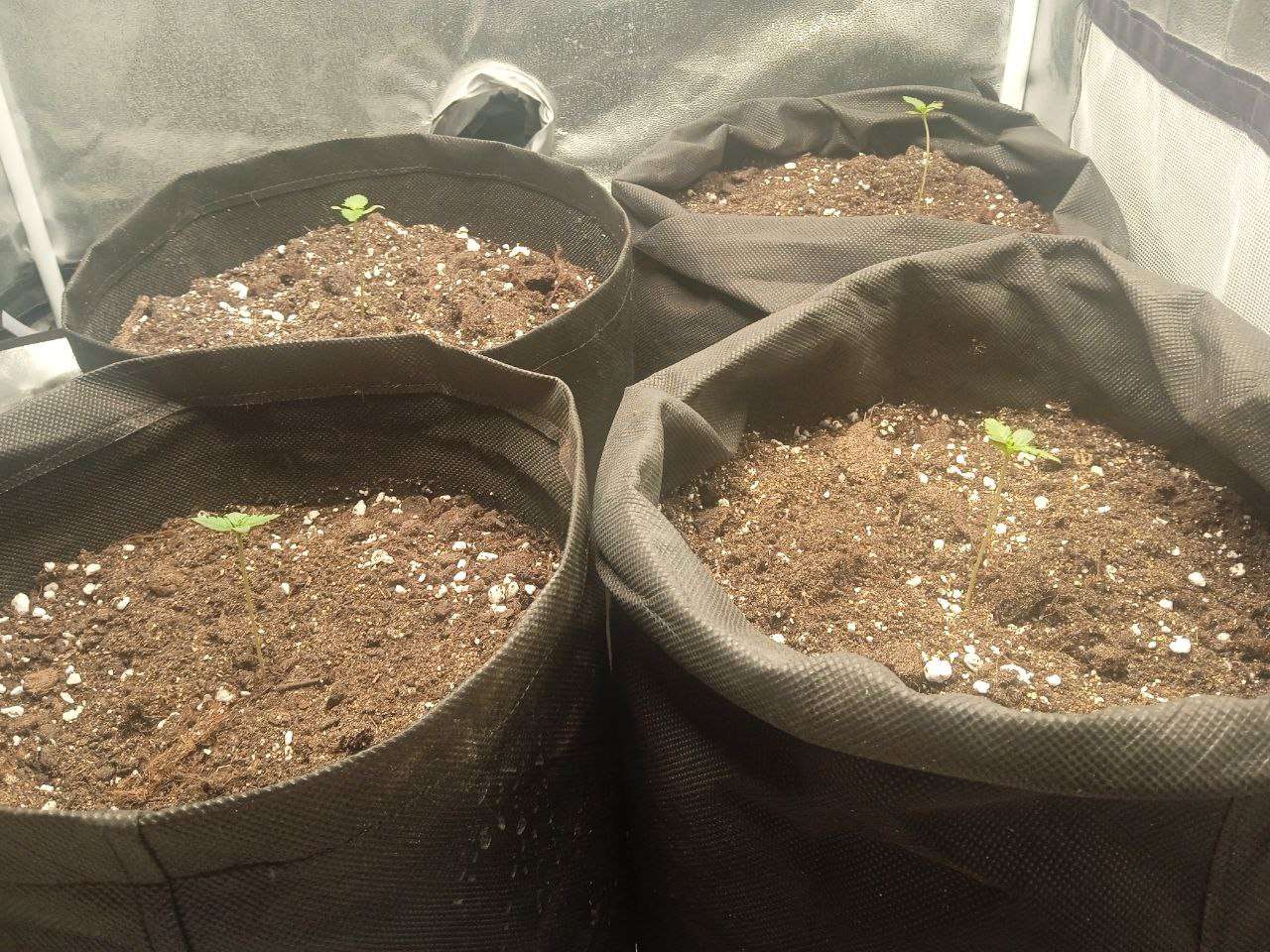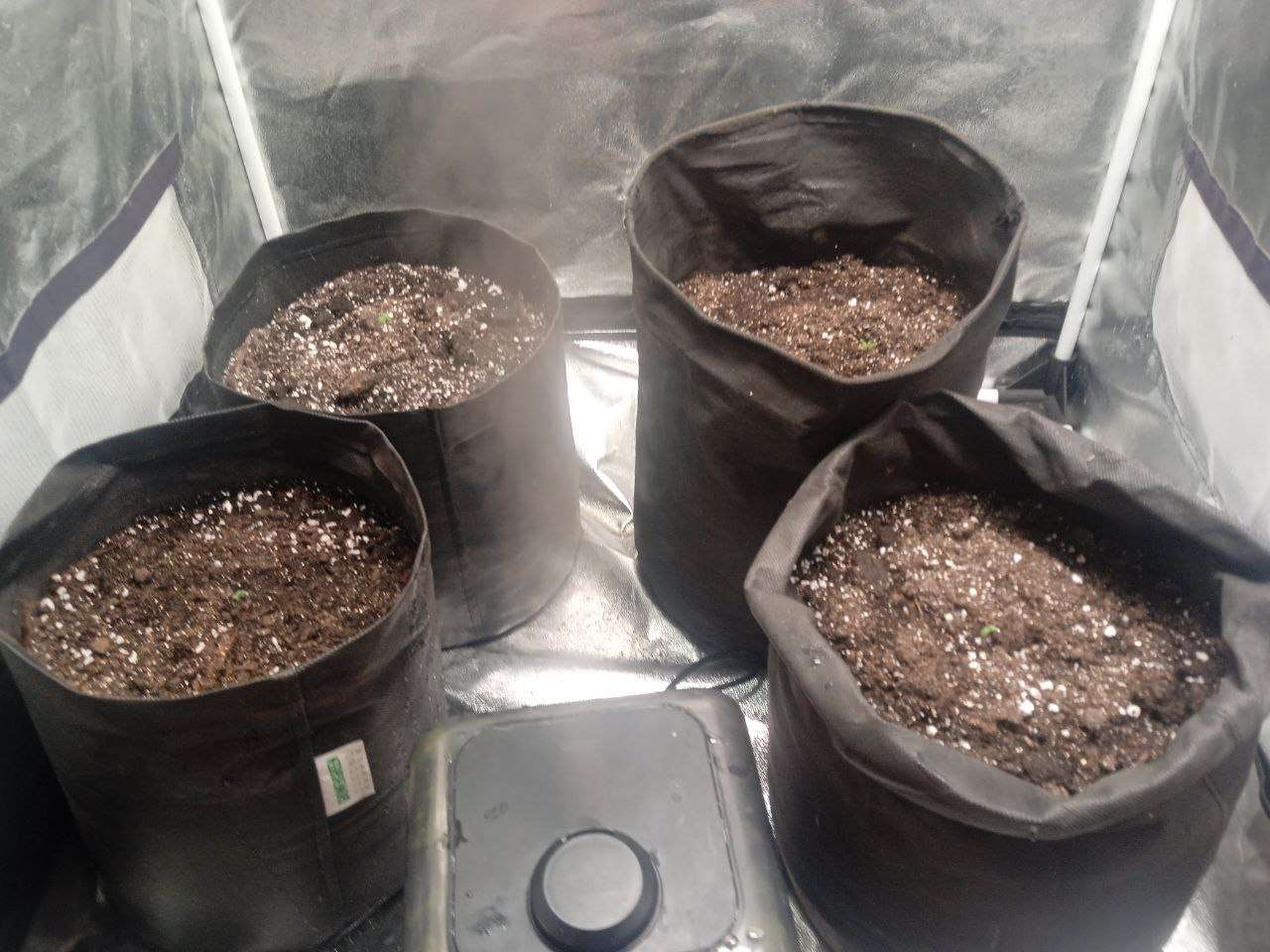 Замешав в 4 мешка по 15 л по примерно 10 литров рабочего субстрата (Сад чудес роза 70%, Вермикулит 15% и Перлит 15%) я высадил все семечки и дело пошло. Стоит отметить, что температура летом в моём краю очень высокая. в боксе она иногда достигала 31 градуса в пике. Лучшее что я мог сделать - включить только одну лампу на 60В от минифермера и выкрутить на макс увлажнитель. Собственно, первая неделя так и прошла. Стоит отметить, что первые 4-5 дней грова свет работал 24\7, просто потому что я забивал настроить электронный таймер. А ещё один важный момент: мне не хватило грунта для одного бэга и я насыпал часть старого, из под предыдущего растения, в котором содержалась куча удобрений и прочей лабуды. Не спрашивайте почему. Я просто псих - эксперементатор и мне было интересно посмотреть прокатит ли такой трюк и что из этого выйдет Кстати, поливал я два раза в неделю, примерно по 400 мл воды 6.5 ПШ и 333 ппм (обычная крановуха. Даже не отстаивал её).