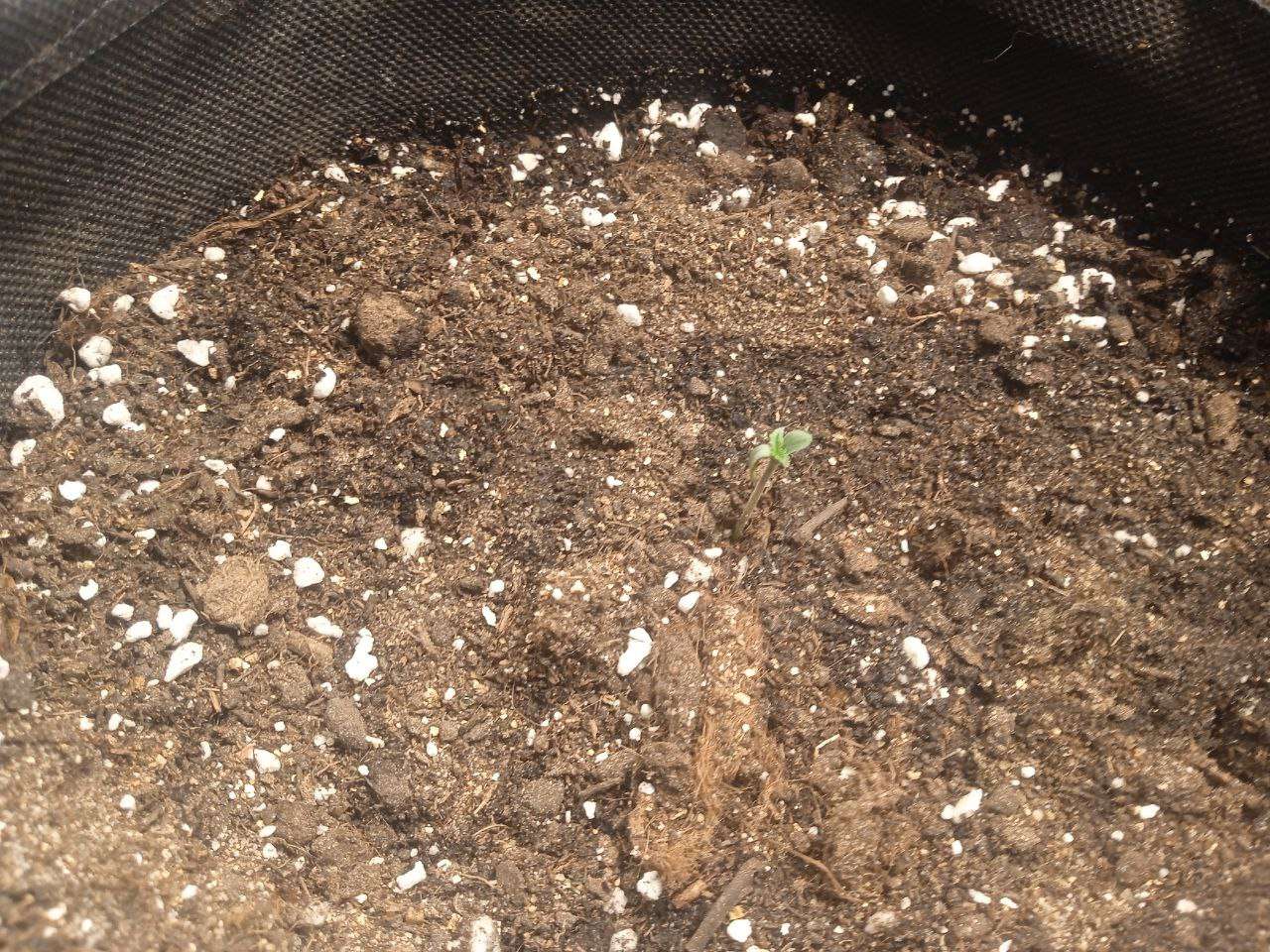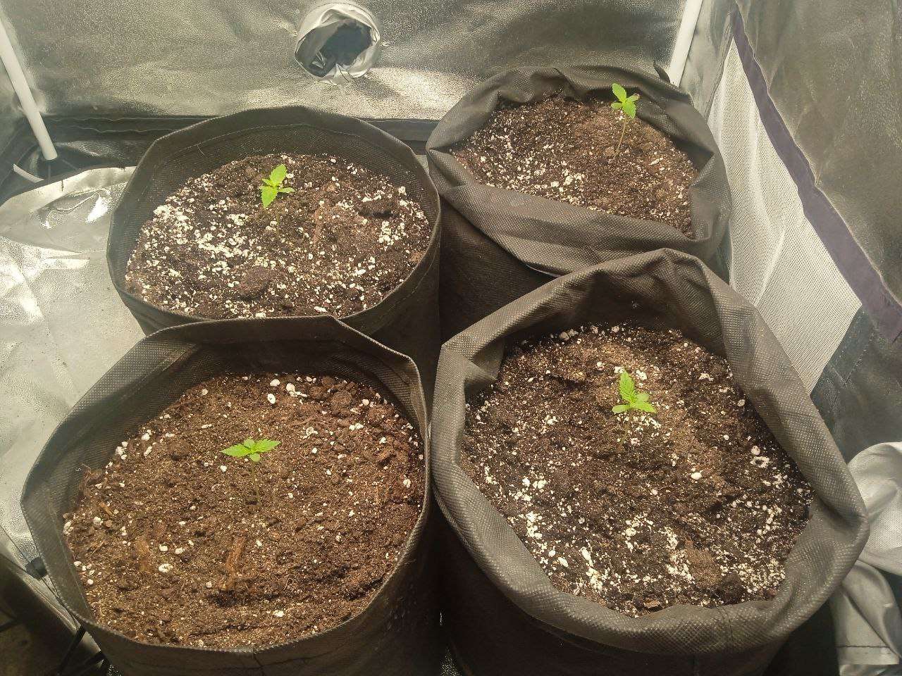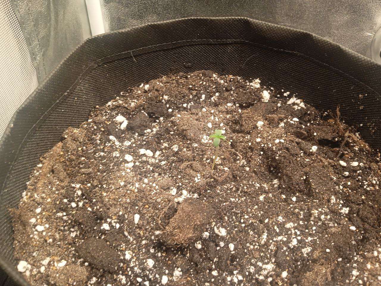 Замешав в 4 мешка по 15 л по примерно 10 литров рабочего субстрата (Сад чудес роза 70%, Вермикулит 15% и Перлит 15%) я высадил все семечки и дело пошло. Стоит отметить, что температура летом в моём краю очень высокая. в боксе она иногда достигала 31 градуса в пике. Лучшее что я мог сделать - включить только одну лампу на 60В от минифермера и выкрутить на макс увлажнитель. Собственно, первая неделя так и прошла. Стоит отметить, что первые 4-5 дней грова свет работал 24\7, просто потому что я забивал настроить электронный таймер. А ещё один важный момент: мне не хватило грунта для одного бэга и я насыпал часть старого, из под предыдущего растения, в котором содержалась куча удобрений и прочей лабуды. Не спрашивайте почему. Я просто псих - эксперементатор и мне было интересно посмотреть прокатит ли такой трюк и что из этого выйдет Кстати, поливал я два раза в неделю, примерно по 400 мл воды 6.5 ПШ и 333 ппм (обычная крановуха. Даже не отстаивал её).