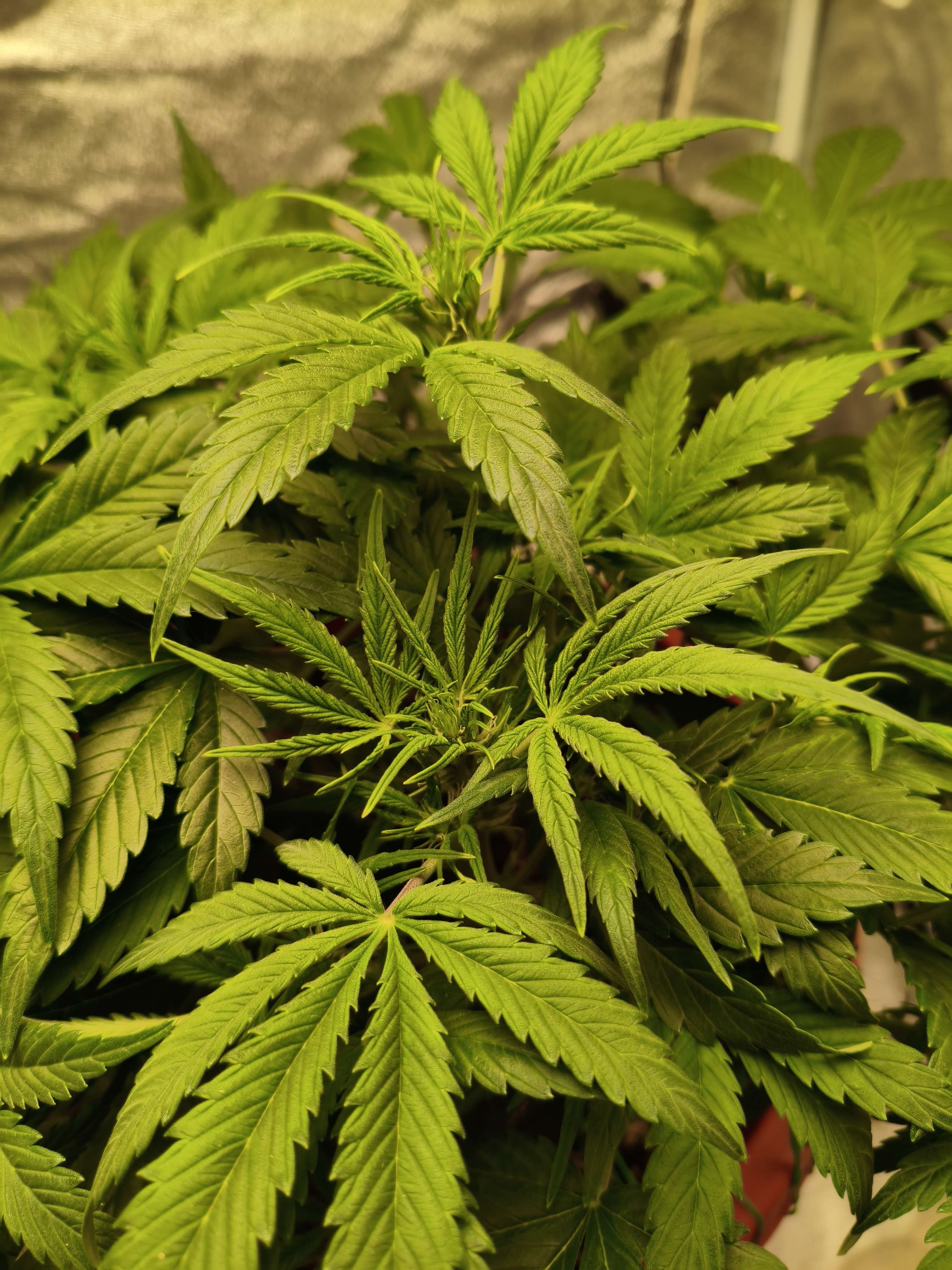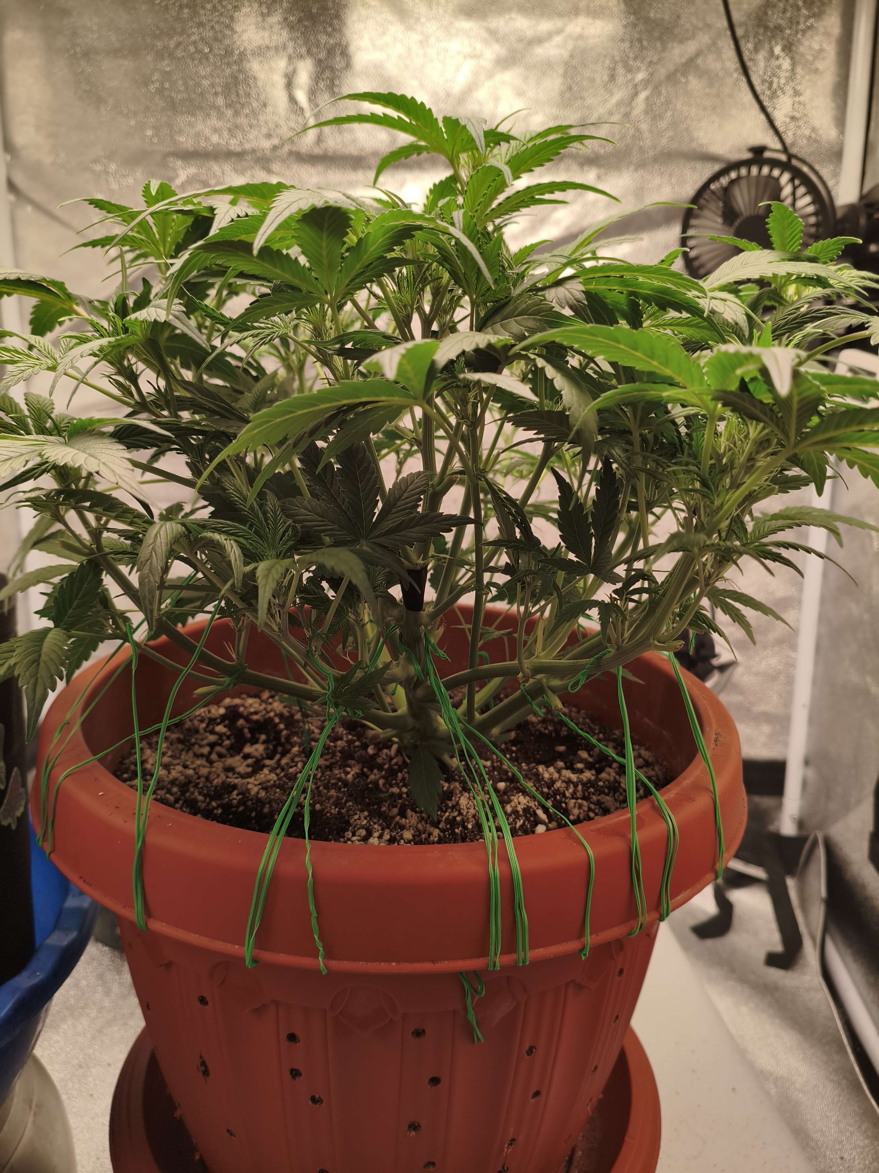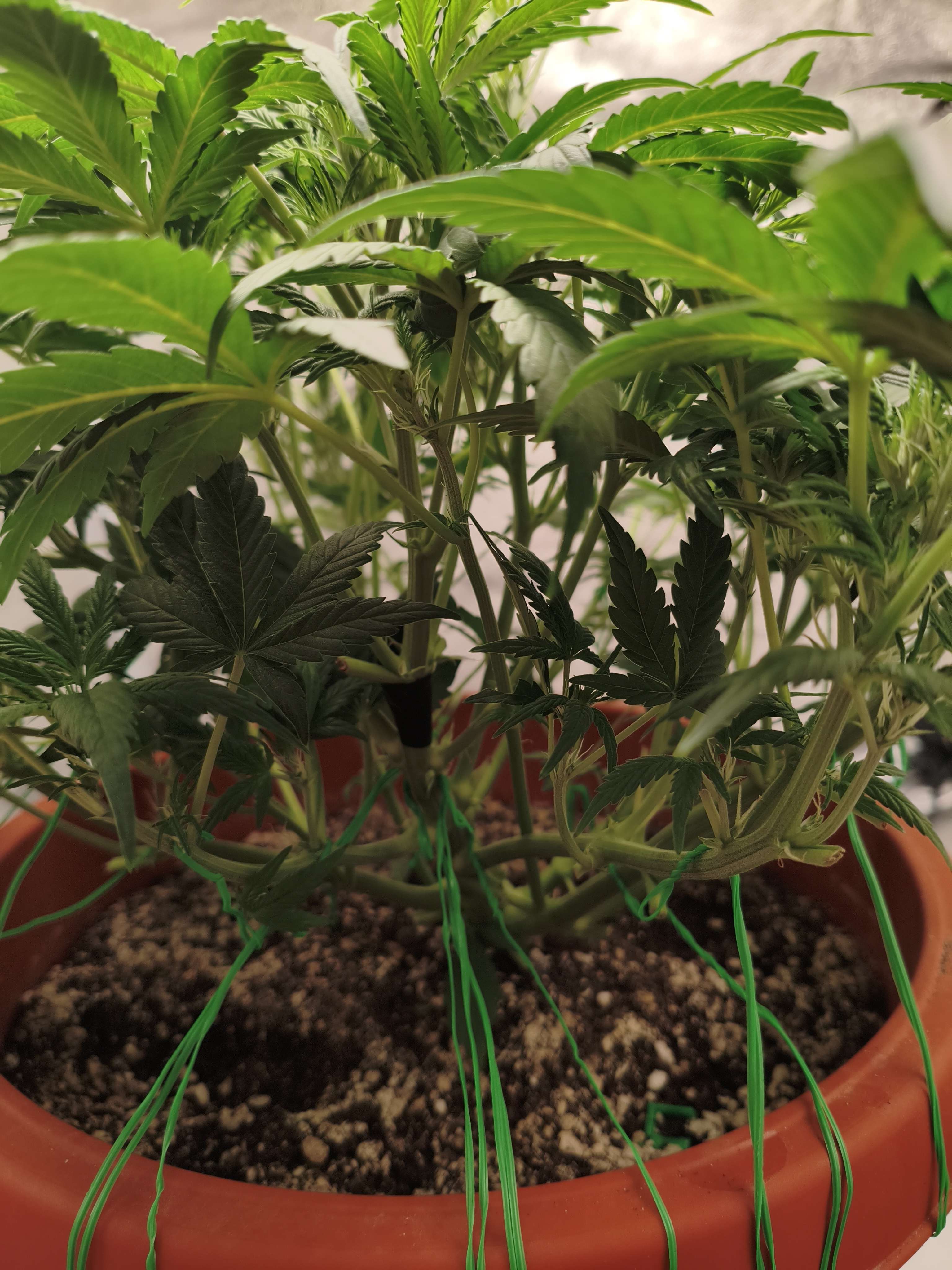 Итак всем доброго времени суток ребята,в общем и целом раста продолжает развиваться и расти,не получилось как хотел оставить ее на пару недель без деформации,так как разрастающейся лапухи закрывают свет,плюс минус перспективным кодам,поэтому подбирал почти полностью все лапухи с нижних ярусов,в общем даже не считал,но очень много,Растишка будто даже лучше стала дышать и чувствовать себя,поэтому пока продолжаем в этом же ритме,убираем,подгинаем,убираем подгинаем и все в этом же духе,клипса сломала центральную колу,не помню на этой или на прошлой недели,залечил изолента,пока вроде растет и продолжает отращивать стигмы,в остальном все по стандарту,на неделе полил один раз минеральным компотом,и ещё раз бизовским,теперь пока буду чередовать их,посмотри как раста отреагирует,сегодня третий полив за неделю,лью по полторахе раз в 2-3 дня,пока вроде едем,на краях верхних листьев,был видимо не большой ожог от лампы,немного подкорректировал высоту,в остальном все пока вроде бы нормально,фото выложу когда раста проснется,пока только фото ботвы)))