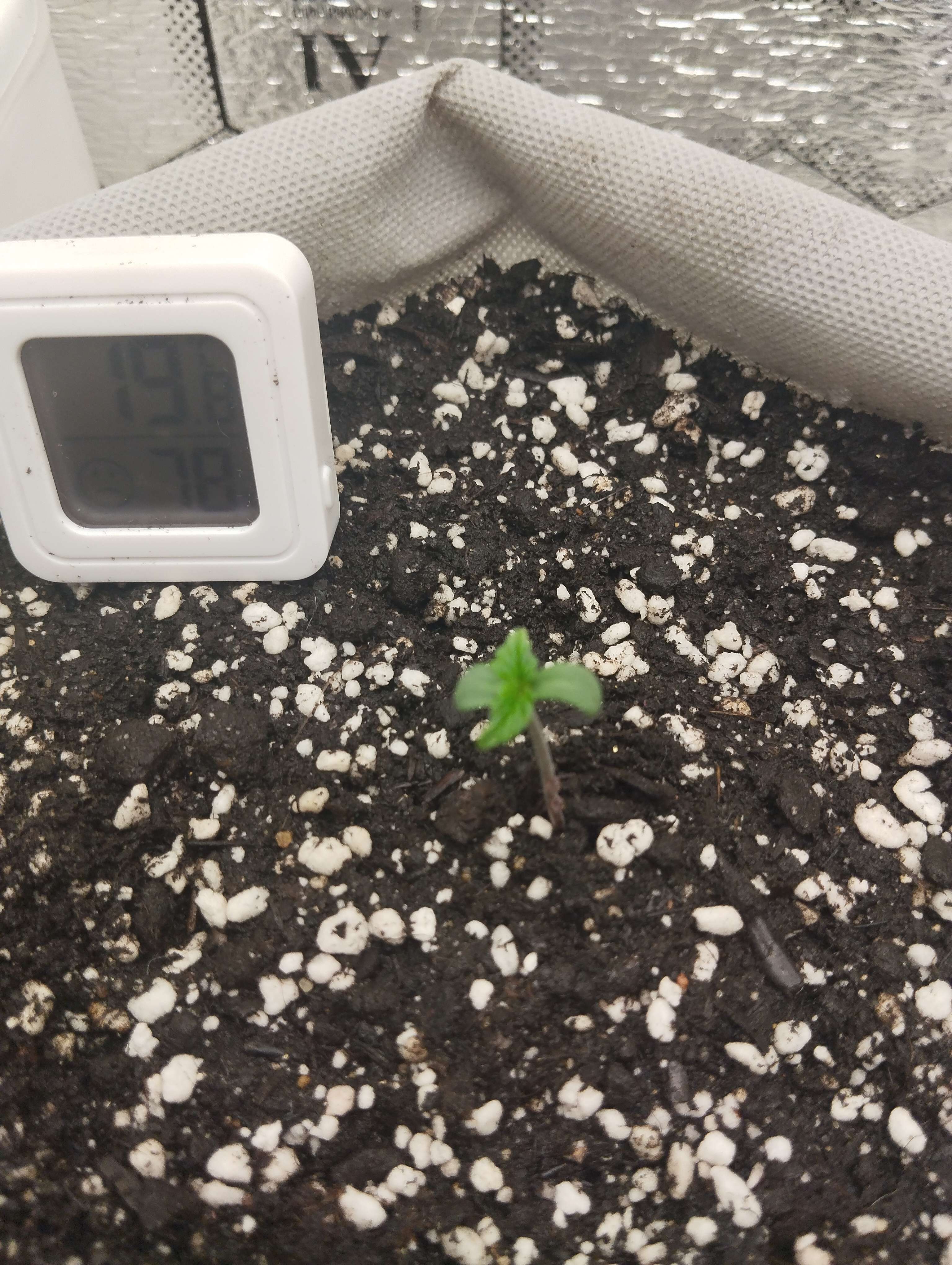 19.02 Заключительный день недели. Замешал 50℅ от дозы удобрения для корней и улучшения почвы. 50℅ аминокислоты 70 шт, 16℅ азота и ещё куча всего. Под корень как пишут лить не стал много. Со шприца 30 мг примерно и остальное по кругу с увеличением к краям . Грунт абсолютно сухой. Дренажа нет. Оно и понятно это ещё литр воды надо. Пролить как бы надо посмотреть дренаж, потому что я не знаю что там вообще, горшок не проливал, а только брызгал слоями, когда насыпал. Сейчас наверное уже нет смысла проливать. На новой неделе это сделаю всё равно. Горшок взвесил для себя после полива, чтобы не ломать голову просох грунт или нет. Сделаю дренаж и решу уже насчёт компота что и как, посоветуюсь конечно. Температура 24,5 , влажность 55-60. Свет 12000 люкс, PPDF 250.Расстояние до макушки 36см, но это наверное ни о чем не говорит у всех разные лампы. Пока всё жду замечаний, если есть. Первый гров должен быть насыщенный, иначе не научишься ничему. Прибавил ещё свет до 13000к lx. Только начали появляться ещё пара листьев. Не знаю даже, но мне кажется она тянется. Листья от ствола 30 градусов. Размер 5 на 5см, но с посыпкой. Не нашёл репорт с этим сортом. Думаю отстаёт по развитию с этим дрочиловом по климату. Подсохнет буду давать еду 50℅.