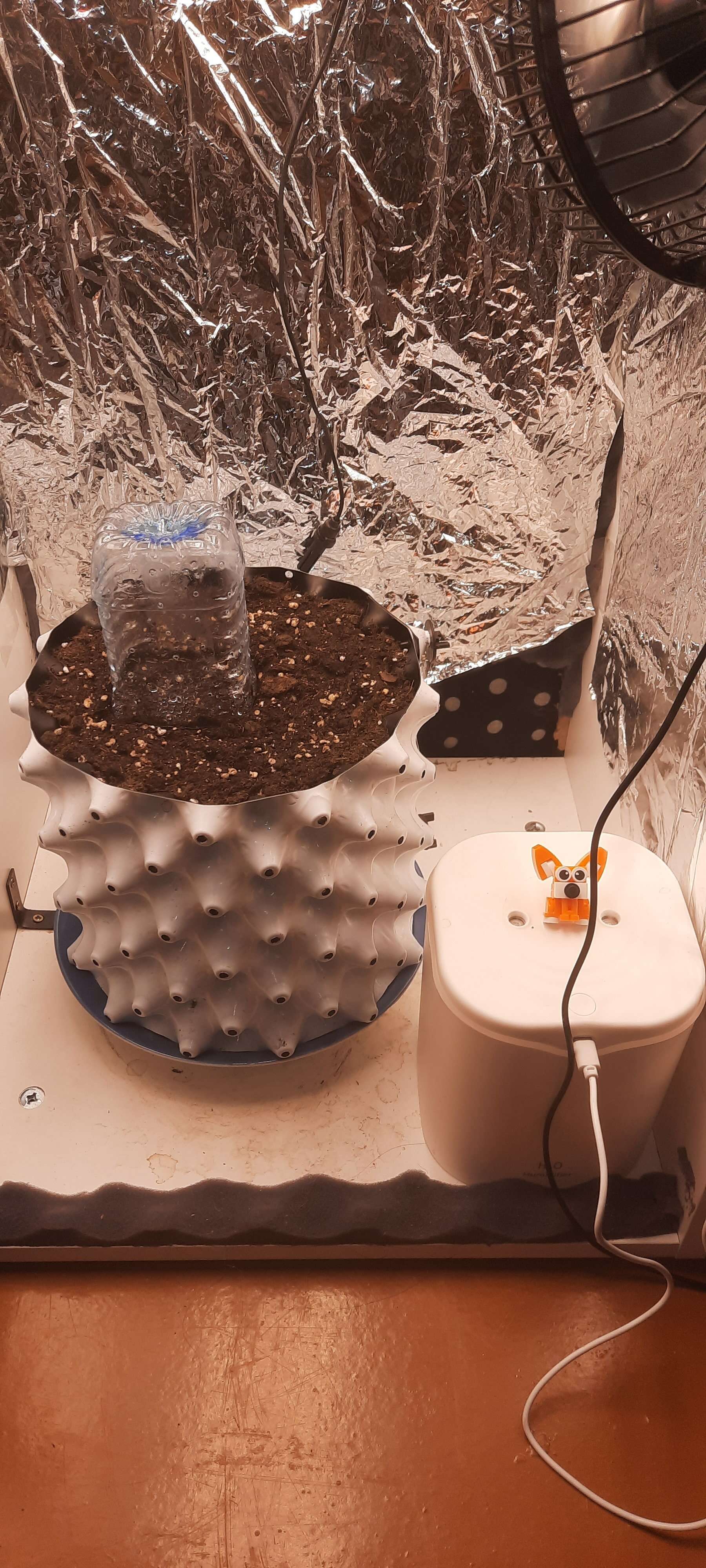 Лампу выше ставить не стал, слишком уж много мороки будет, отодвинул в край бокса, люксов должно стать поменьше. Сейчас поставил новый увлажнитель с управлением с телефона,потому что нет возможности каждые 12 часов включать старый. Влажность будет держать на уровне 65%. Темпера 26-27° сейчас.