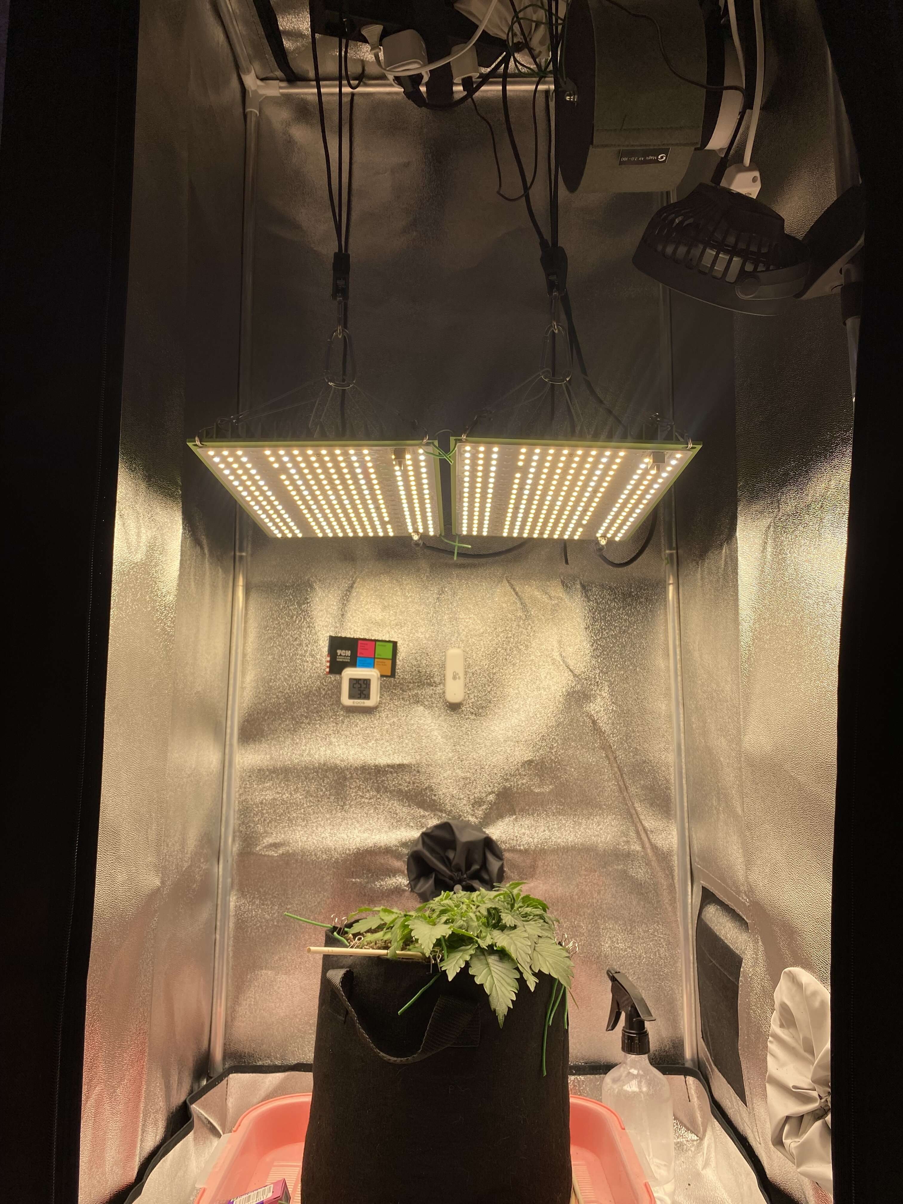 Влажность с вытяжкой упала оч сильно, там и вентилятор дует и вытяжка работает и лампа греет. В итоге на следующий день после полива такая картина, боюсь представить чтобудет через неделю как я приеду... Сухарик.............