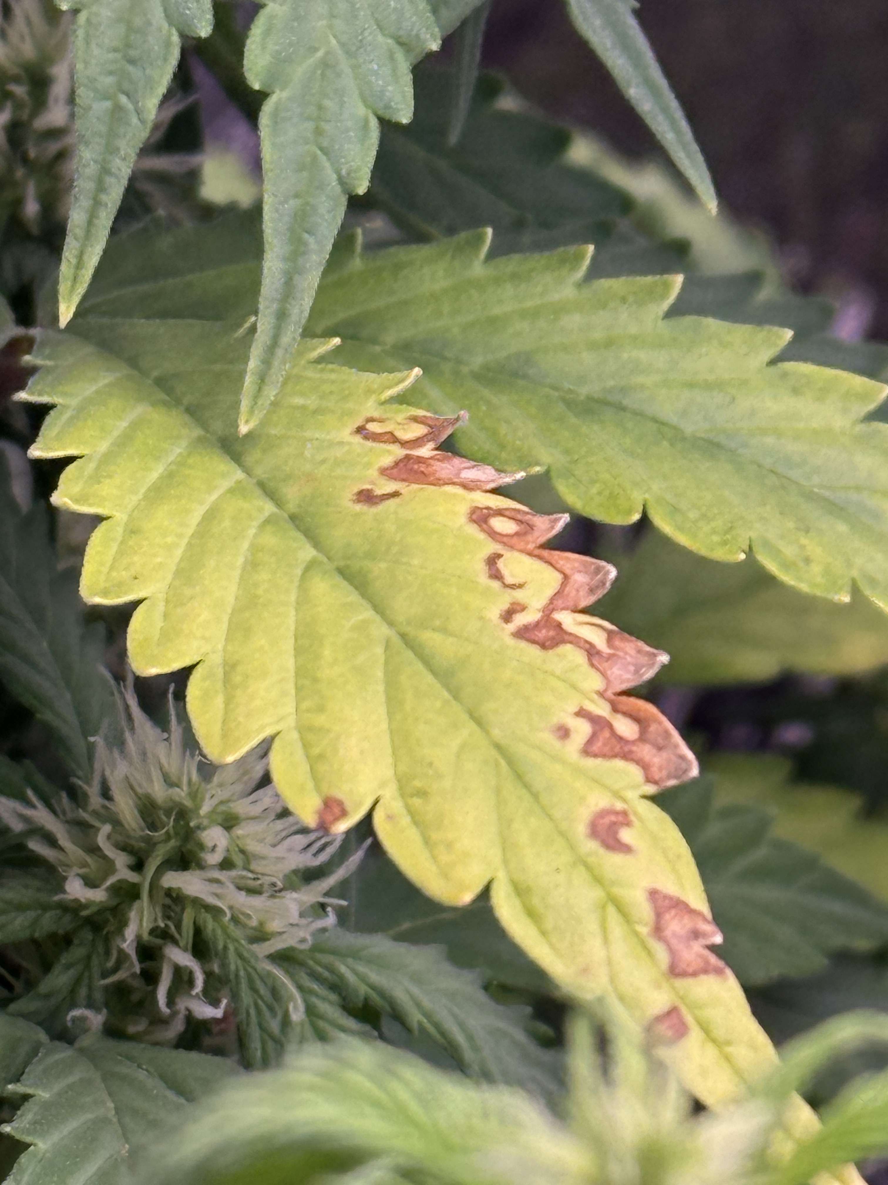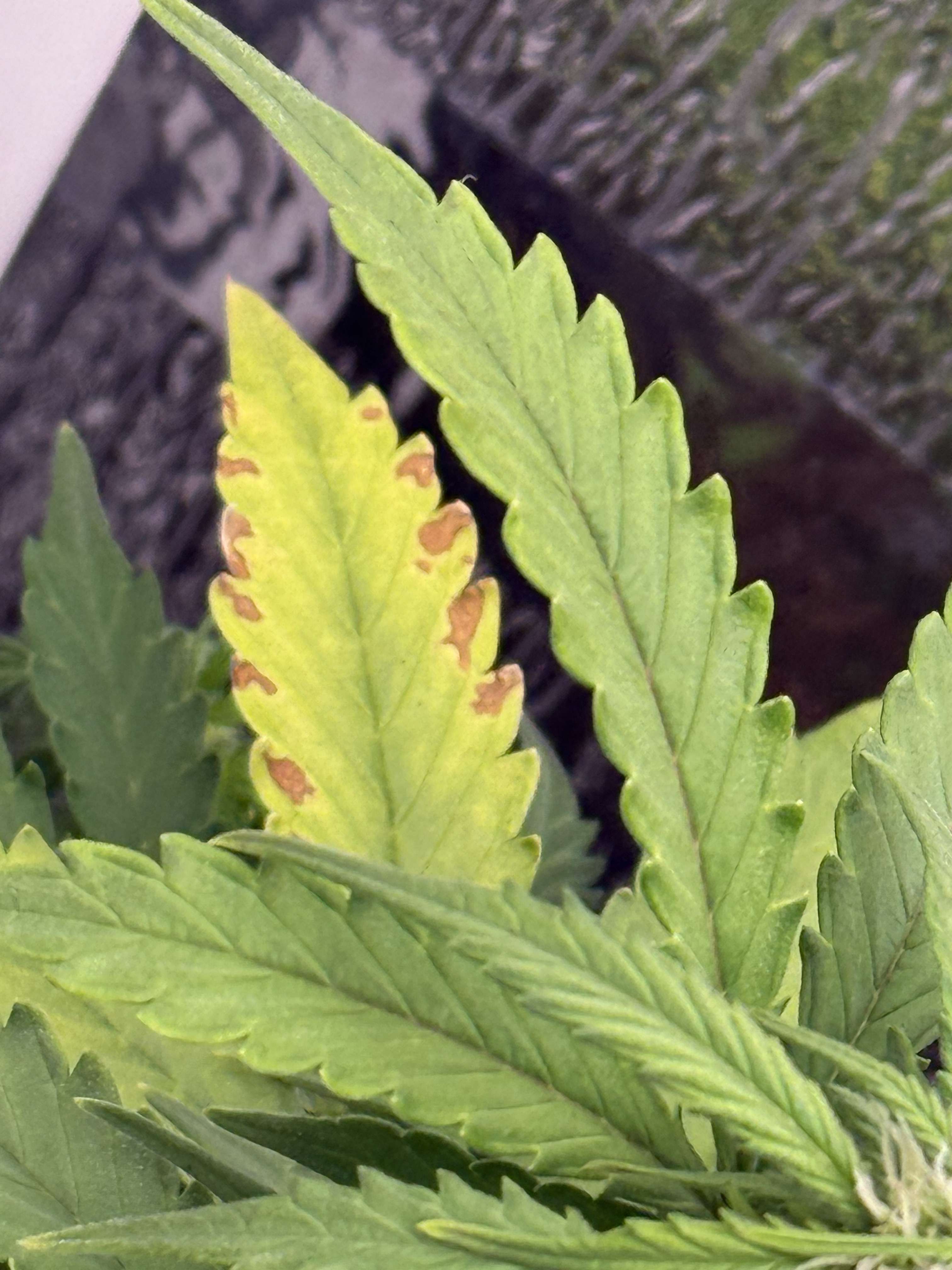 Думаем, что это совокупный ожог от ветра и лампы, т.к. это самые продуваемые и освещенные частички листьев.