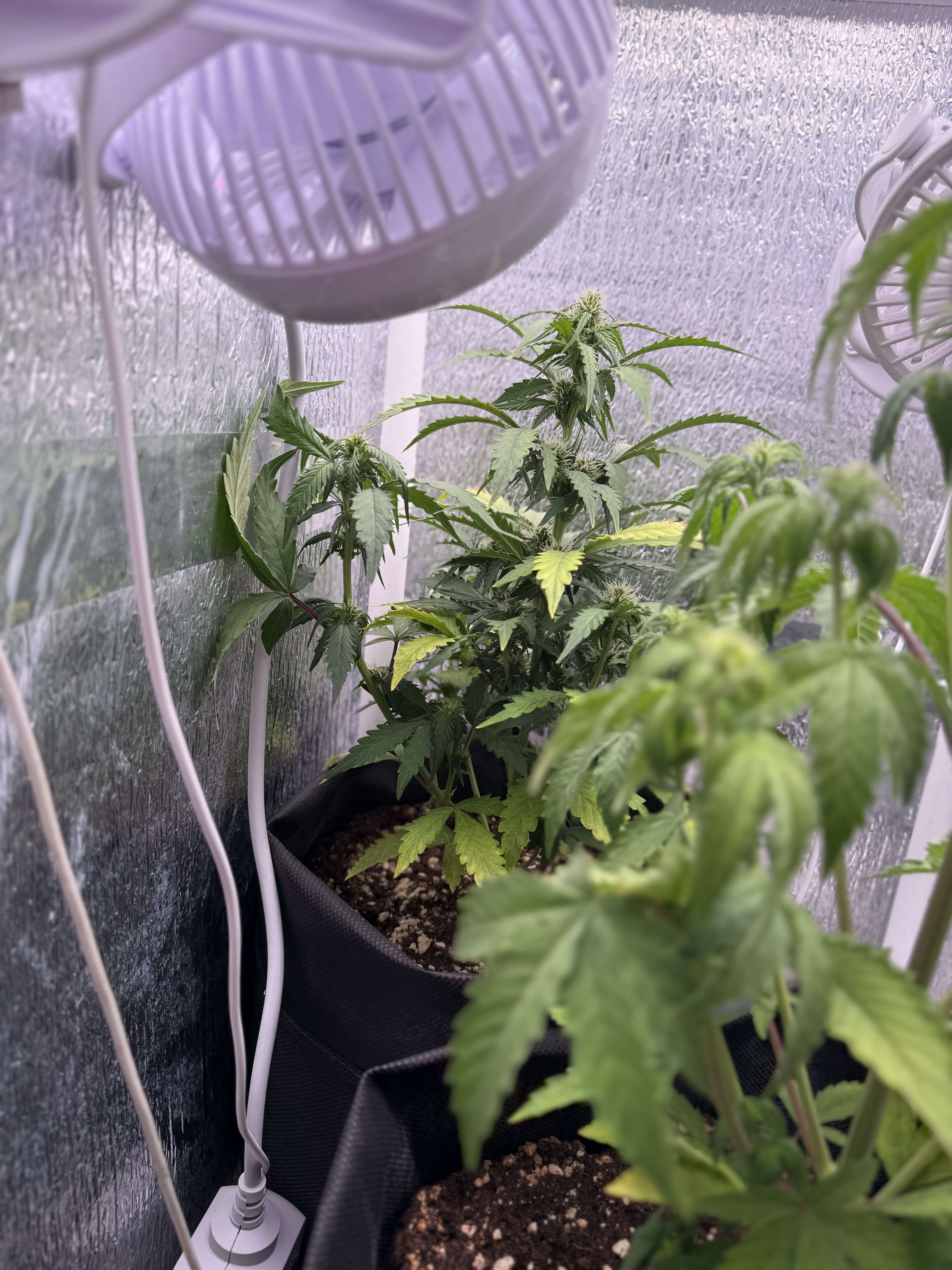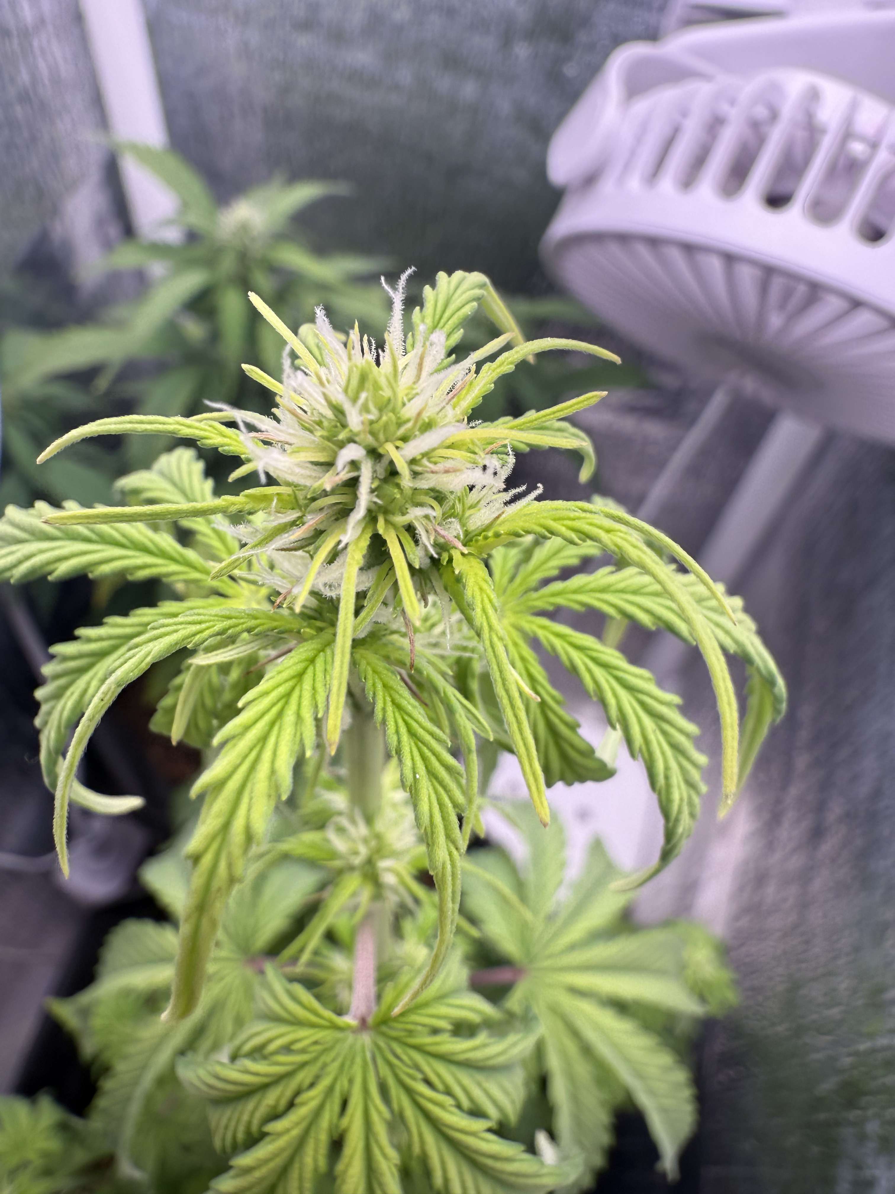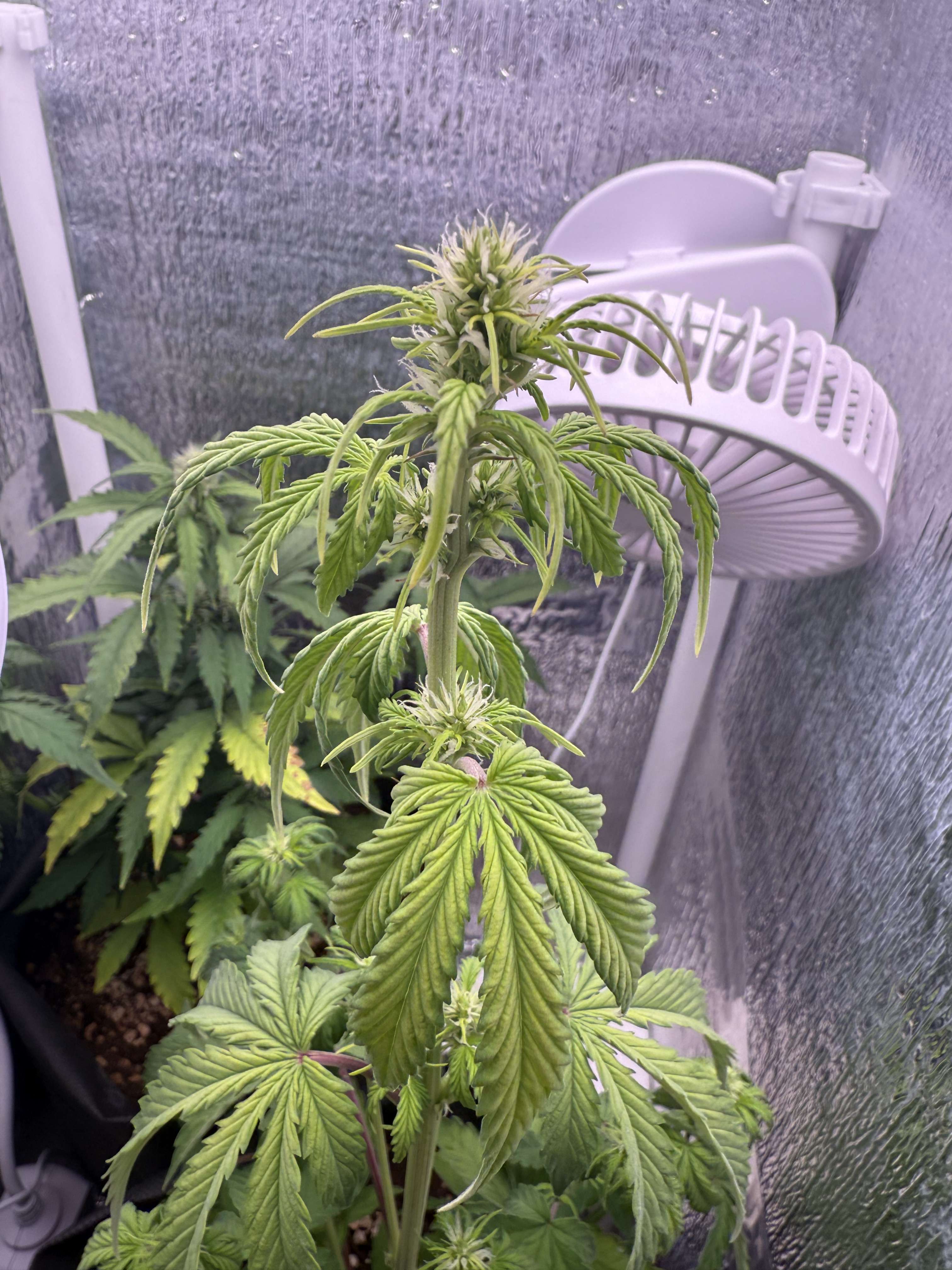 Такая длинная "удочка" под светильник является проблемой: во-первых, все нижние соцветия получают мало гормонов роста. Мало света. Во-вторых, вершинная кола получает "пересвет" и может всю растишку потянуть в гермофродитизм. И происходит это именно на второй фазе цветения.