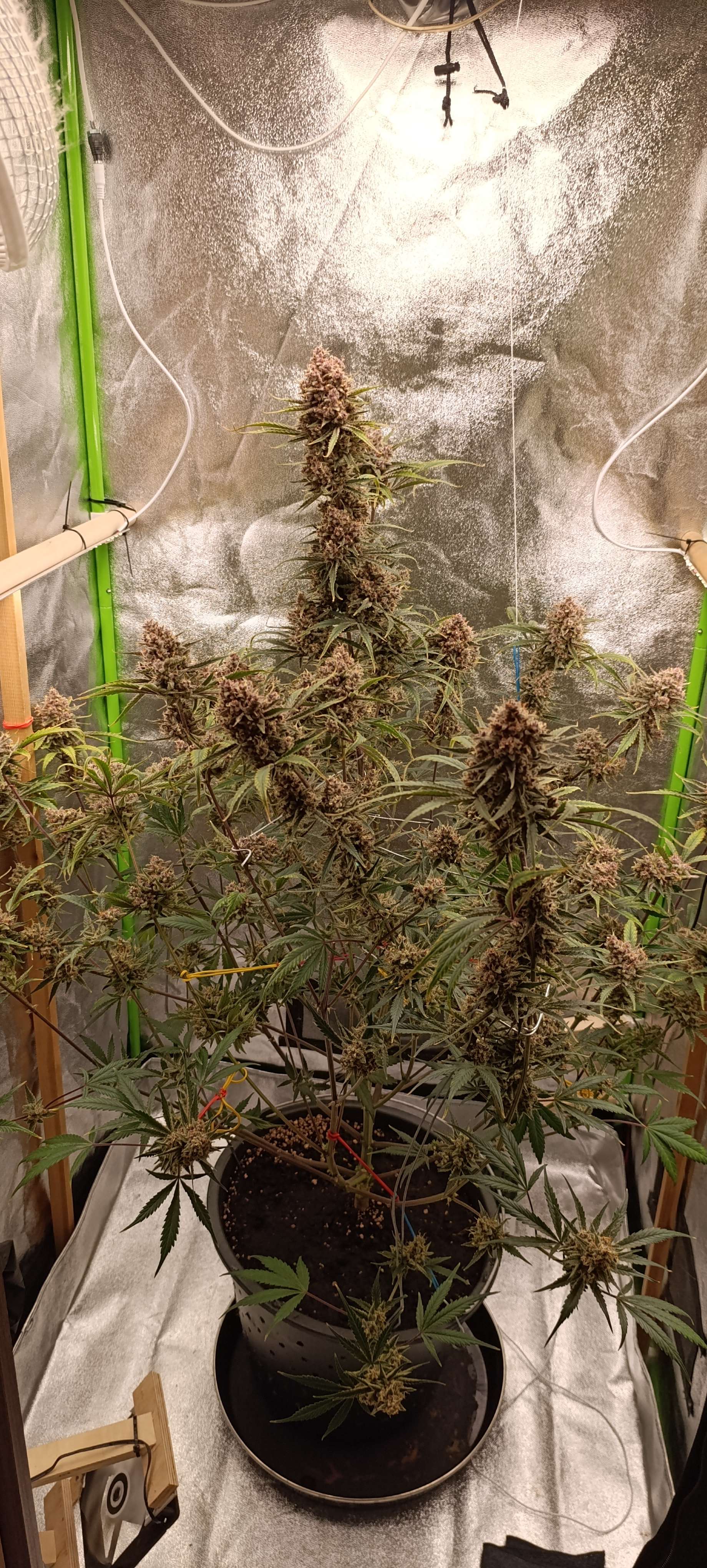 Полили компотом, четыре литра. Дренажа грамм 50. Пухнет, вся уже подвязана. Стебли получились тонкими, вес шишек не удержать.🫣