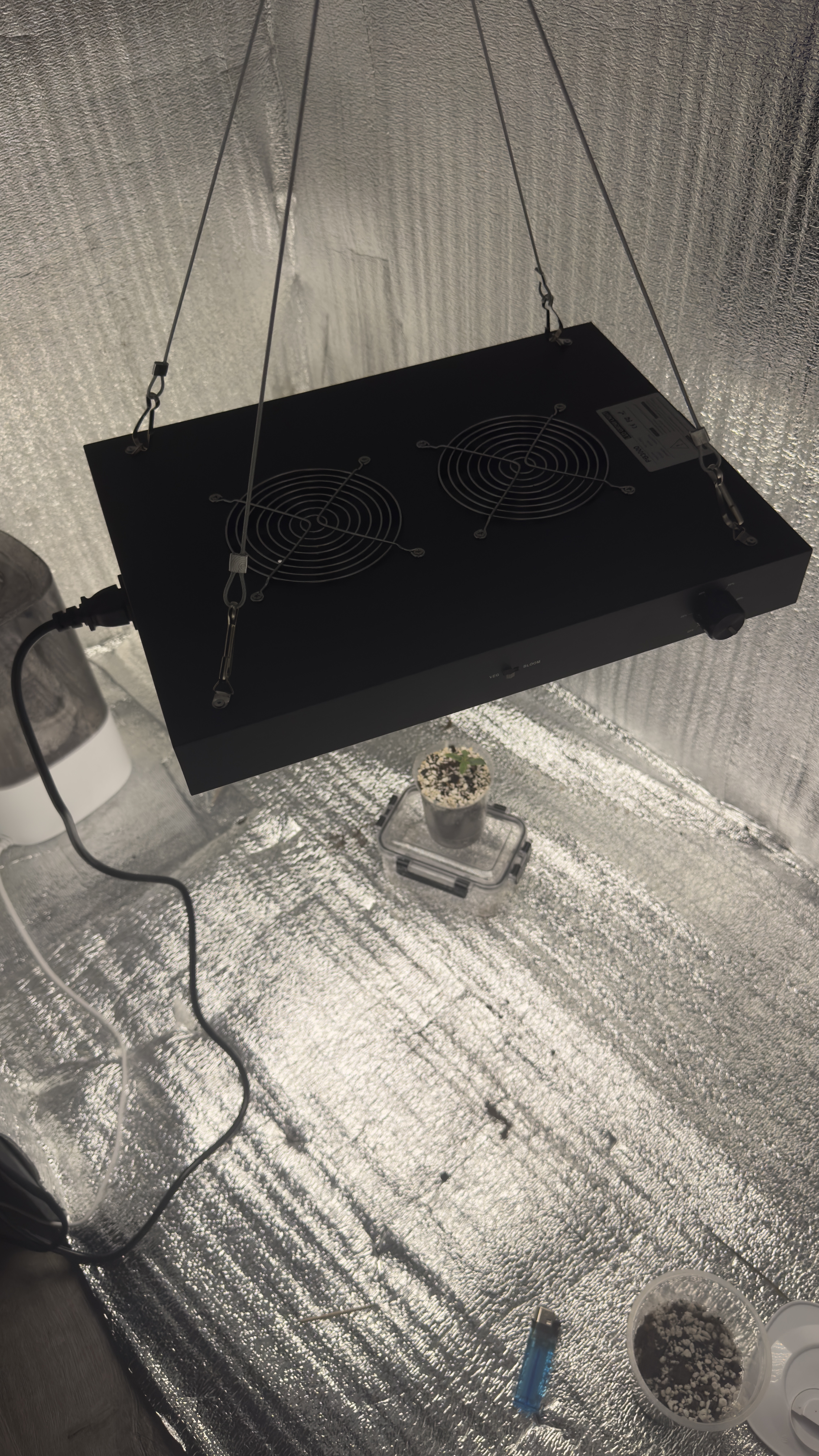 2 режима (вега->цветение), по ощущениям в боксе стало светлее раза в 2.5, диммер на 100, вывесил на 25 см от верхушки растихи, руководствуясь методикой, пока руке тепло не станет, ниже побаиваюсь опускать, сутки понаблюдаю как себя вести начнет, а там если что подкорректирую высоту.