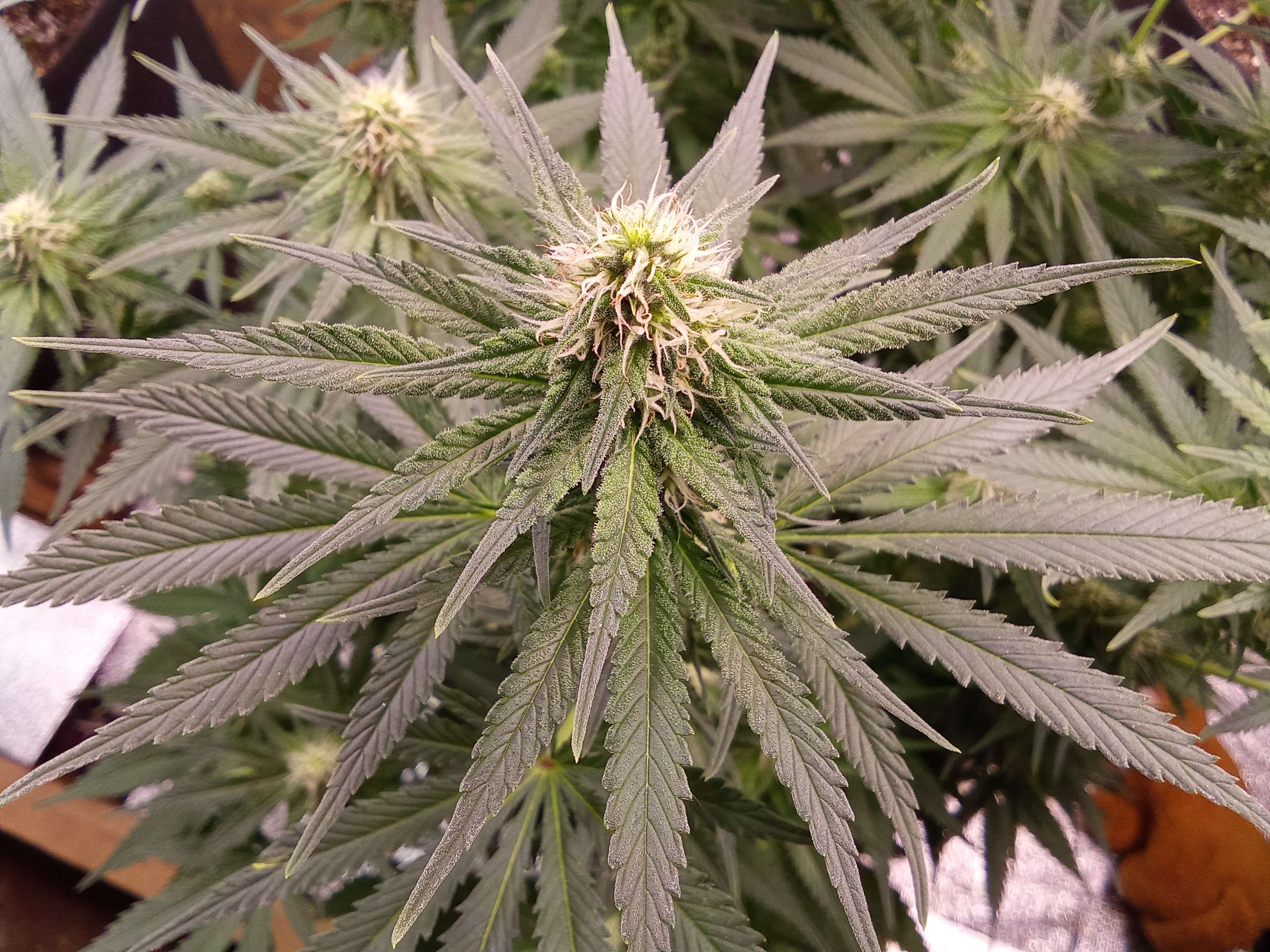 Пис, родня! Хорошего настроения и отличного дня вам! Выкладываем промежуточный отчет о ходе грова) У нас ровно середина 11-й недели, нашей девочке 74 дня, 11-й день цветения) Жара немного отпустила... Не сильно, но 34 это не 42))) Вроде до конца недели будет 32-33, а потом опять обещают температурные рекорды... жесть, что тут скажешь.... В боксе у нас 28-29, держим высокую влажность (80-90), чтобы растишка комфортно усваивала питательные вещества... В целом наша яблочка не выказывает особых недовольств по поводу жары - листики упругие, смотрят вверх) никаких признаков теплового или светового ожога (слава Джа!)...