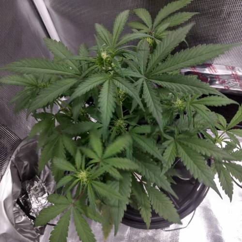 На шестой неделе растишка показала первые признаки цветения. Сам кустик стал заметно выше и пышнее – от медленного развития на первых неделях вегетации он перешёл к более стремительному росту в последние недели веги и начальной фазе цветения. Показатели окружающей среды остались без изменения. Гровер добавил в схему питания Recharge – экспериментальное органическое удобрение. Его количество составляло 1.3 мл/л.